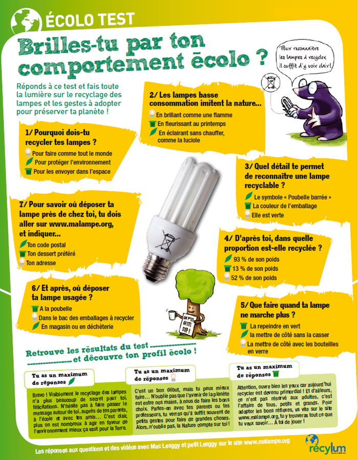 Que tu aies brillé ou non par ton comportement écolo, retrouve ci-dessous quelques explications sur le recyclage des lampes usagées. Et si tu n’as pas encore fait le test, découvre à ton tour ton profil écolo.