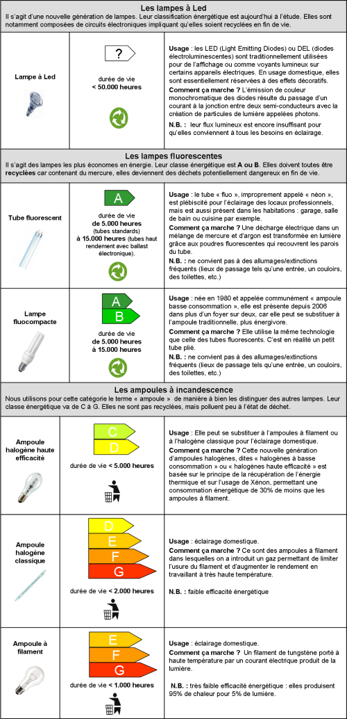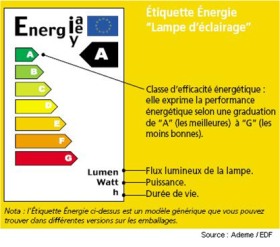 Les économies d’énergie sont aujourd’hui au cœur des politiques de lutte contre le réchauffement climatique. La notion d’économie d’énergie est toute relative. Il est donc nécessaire d’établir des points de repère. C’est pourquoi pour les lampes, tout comme pour les autres équipements électriques et électroniques, l’étiquette énergie est obligatoire. Y sont mentionnées la durée de vie, l’efficacité énergétique et l’efficacité lumineuse : plus le nombre de lumens par watt est élevé, plus la quantité de lumière émis est grande, pour une même énergie consommée. Sont également indiquées la puissance et la durée de vie de la lampe. Ainsi, nous nommerons lampes à économie d’énergie les lampes dont l’efficacité énergétique est A ou B, bien que de nouvelles technologies permettent aujourd’hui à certains types de lampes telles que les halogènes, de réaliser de réelles économies d’énergie.